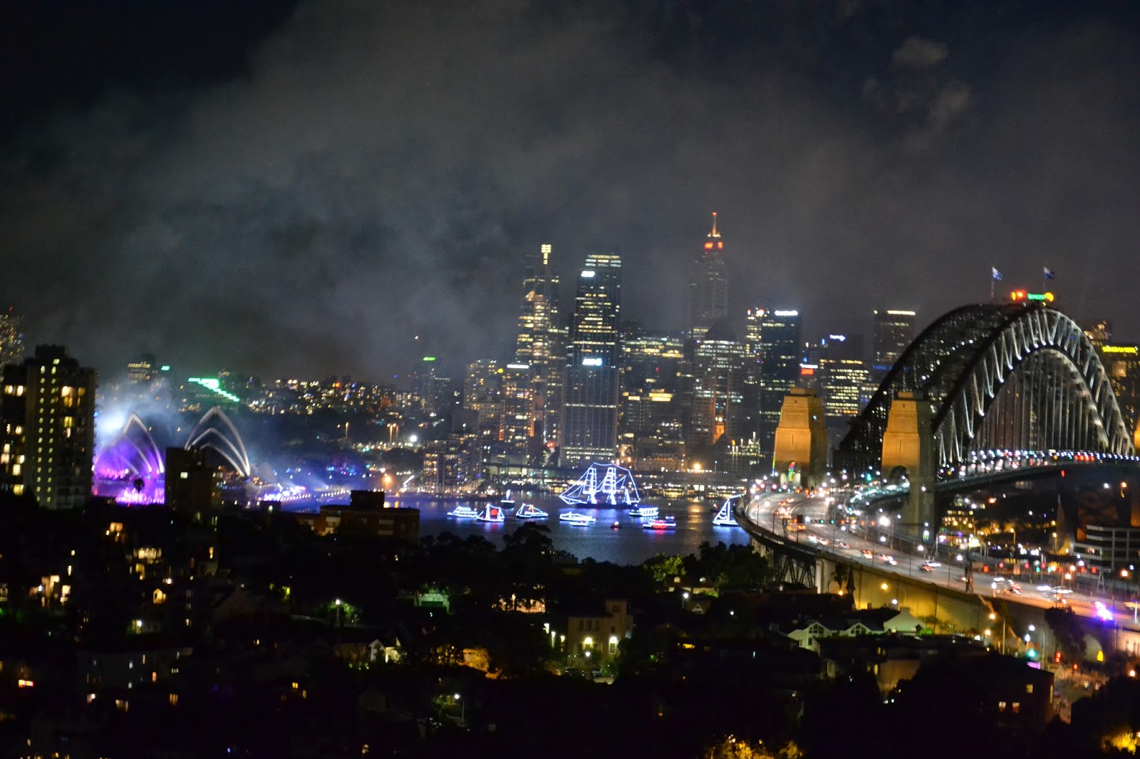 Ari's friend Brian (who I was staying with) had our NYE plans all sorted out. We got to do a little bit of party hopping in a building with some great views. We ate, drank, talked, hung out on the balcony, and watched the NYE celebrations as the sun went down. We saw some air displays and a tug boat water display. At 9pm, there were the pre-fireworks show. So we got a little bit of a tease of what was to come at midnight. This was followed by some boats all lit up parading around the harbor.